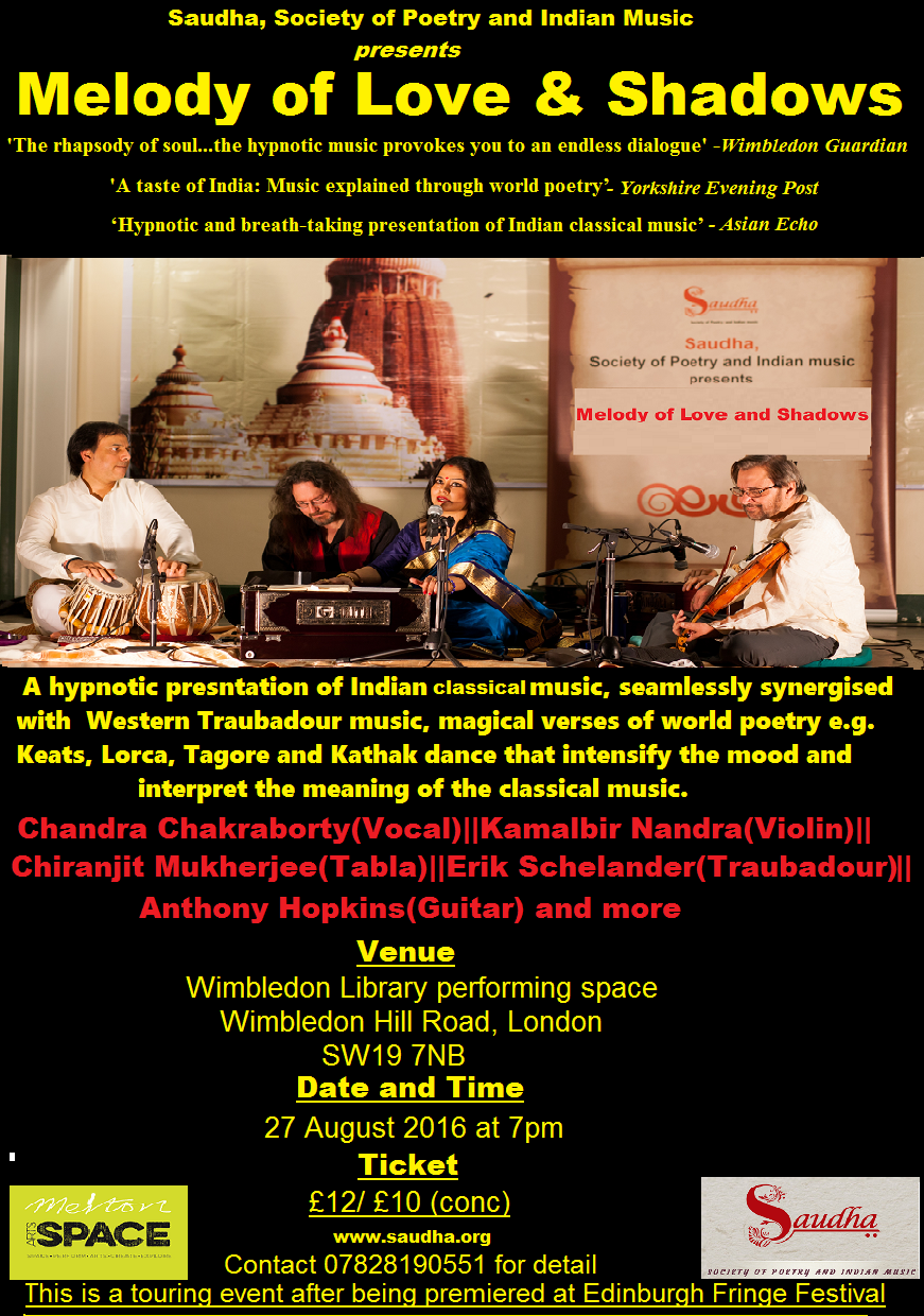 Saudha, Society Of Poetry and Indian Music: 'one of the prominent Indian classical music promoters in the country' (BBC Radio), offers this two-day appearance in Fringe Festival with a hypnotic and 'breath-taking' presentation ('Rhapsody of Soul' -Guardian|| 'Seraphic ecstacy of Indian Raaga Music'- Yorkshire Reporter) of Indian classical music by a UK based vocalist vocalist Chandra Chakraborty and critically acclaimed, prominent accompanying artists like Baluji Shrivastav OBE (Sitar) Kamalbir Nandra (violin), Chiranjit Mukherjee (tabla) and Showmi Das (Kathak). This is seamlessly mingled with French, medieval, romantic troubadour music and haunting verses of world poetry in English by actor and Schubert vocalist Erik Schelander, to interpret and intensify the profound mood of the transcendental music.