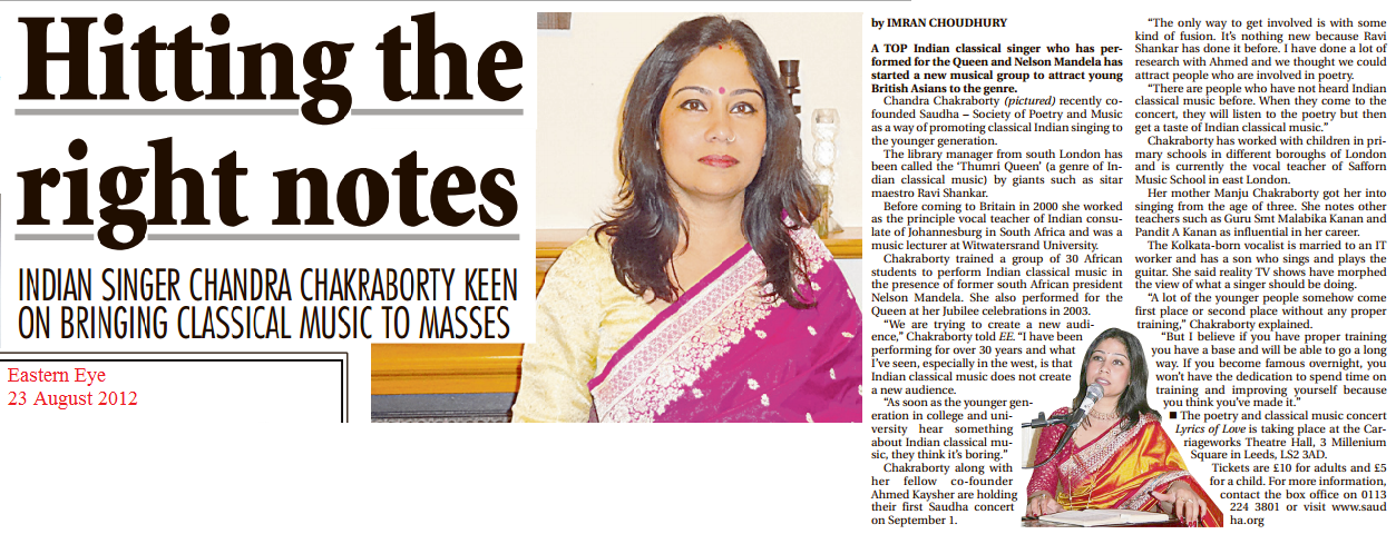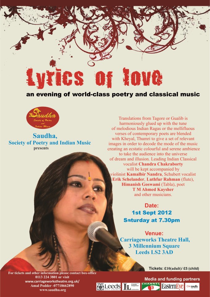 Chandra Chakraborty, a UK based classical singer was accompanied by Kamalbir Nandra (violin), troubadour vocalist Erik Schelander, Luthfur Rahman (flute), Himanish Goswami (tabla), Sami Kergupta (guitar), Amal Podder (mandira), poet T M Ahmed Kaysher and other musicians.